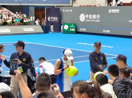 今年的中网执勤由牛凯生、李全胜老师领精挑细选的20名学生(16名男生、4名女生)全程参与,从9月29日至10月6日,共计8天的时间里,承担了世界级网球男子排名前10、女子排名前30球员入住酒店、商务活动、球员酒会、训练、比赛等过程的随身护卫工作。全体师生克服时间跨度大,执勤岗位多,勤务内容繁重,早晚温差大等诸多困难,圆满完成了值勤任务。其中同学们在护送球员参加商务活动,出席球员酒会等重要工作中任务完成突出,受到了中网组委会的高度好评。特别值得骄傲的是,白岩同学现场执勤的风采还被现场的新闻记者录镜,在体育频道播出。虽然牺牲了整个国庆假期,但是同学们一致认为这是一次难得的专业实践经历,在这个过程中开阔了视野,增加了阅历,学到了课堂上学不到的知识与技能,为今后的工作积累了宝贵的经验,表示非常乐于参加这样的实践活动。